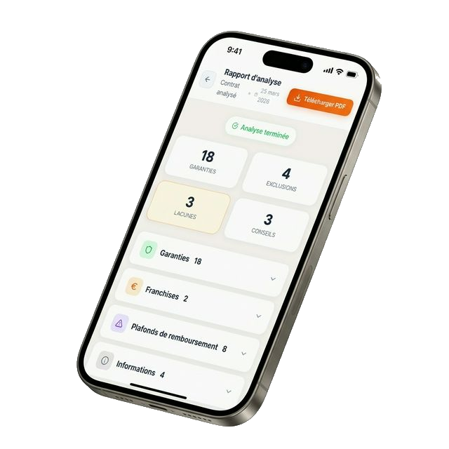Un rapport détaillé avec les garanties, exclusions, lacunes identifiées et recommandations personnalisées.